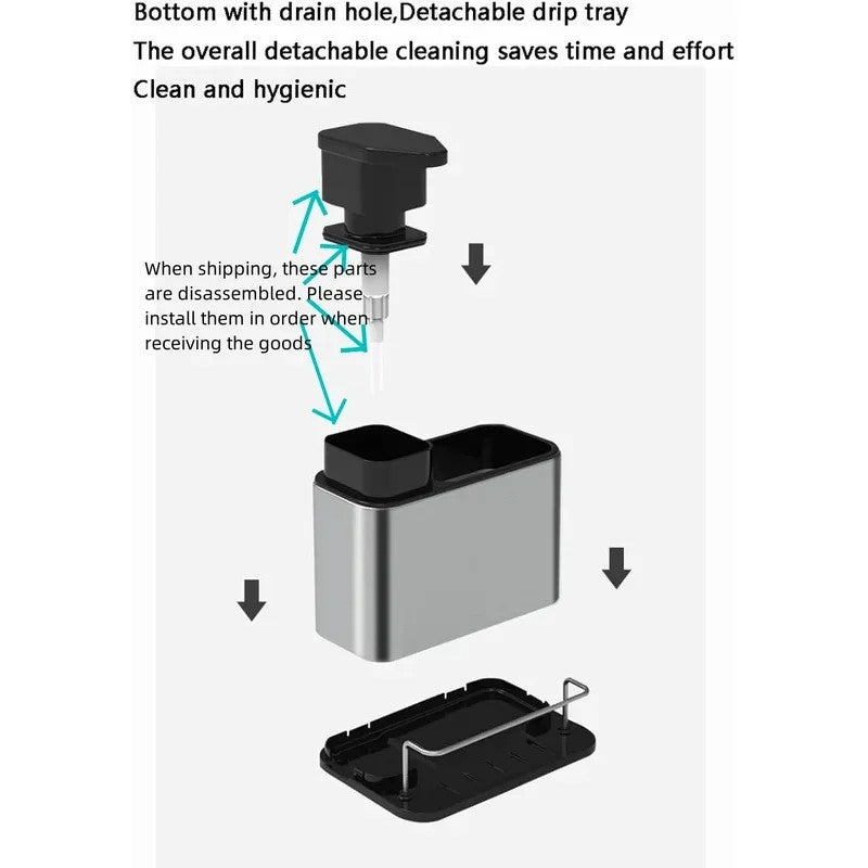 3-in-1 Kitchen Stainless Steel Tableware Soap Dispenser, Sponge Holder, Sink Organizer Drain Rack, Suitable for Kitchen Sinks